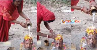 ഭർത്താവിനെ മണ്ണിൽ കുഴിച്ചിട്ട് തലയിൽ ശിവലിംഗ പൂജ നടത്തി ഭാര്യ