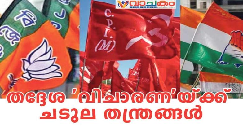 ജനാധിപത്യത്തിന്റെ അടിത്തറ ഉറപ്പിച്ചുനിർത്താനുതകുന്ന തദ്ദേശ തെരഞ്ഞെടുപ്പങ്കത്തിന് കേരളത്തിൽ നാളുകുറിച്ചതോടെ പുതിയ അടവുകളുമായി മൂന്നു മുന്നണികളും കളത്തിലേക്ക്. കൂട്ടലും കിഴിക്കലുമായി എൽ.ഡി.എഫും യു.ഡി.എഫും കച്ചകെട്ടുന്നതിനിടെ മുമ്പുണ്ടാകാത്ത തരത്തിലുള്ള പ്രതീക്ഷയുമായി ഗോദയിൽ എൻ.ഡി.എയും സജീവമായിത്തുടങ്ങി. അട്ടിമറി ജയങ്ങളുടെ സ്വപ്നം താലോലിക്കുന്നു മൂന്നു മുന്നണികളും.