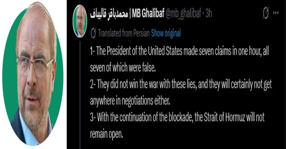 ഘാലിബാഫിന്റെ നിലപാട്: അമേരിക്കൻ നാവികസേന ഇറാനിയൻ തുറമുഖങ്ങളെ ഉപരോധിക്കുന്നത് തുടർന്നാൽ കപ്പൽ ഗതാഗതം തടയുമെന്ന് ഘാലിബാഫ് വ്യക്തമാക്കി. "കടലിടുക്ക് തുറക്കുന്നതും അടയ്ക്കുന്നതും തീരുമാനിക്കുന്നത് സോഷ്യൽ മീഡിയയല്ല, മറിച്ച് യുദ്ധഭൂമിയിലെ സാഹചര്യങ്ങളാണ്," എന്നദ്ദേഹം ഓർമ്മിപ്പിച്ചു.