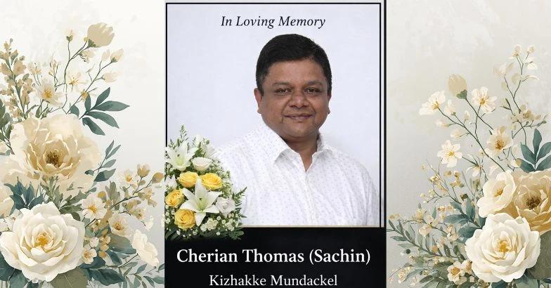 English Summary: A Malayali expatriate from Chengannur passed away in Barrie Ontario Canada due to cardiac arrest. Cherian Thomas also known as Sachin was 50 years old. He was a member of the Mundakkal family in Thiruvanvandoor and is survived by his wife Jaya.