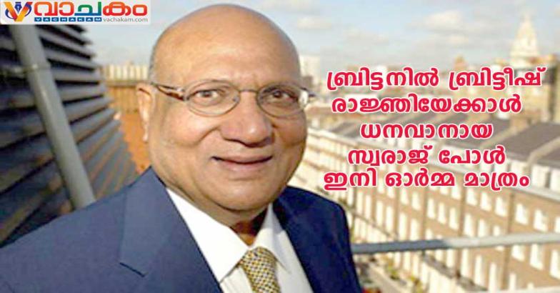 ബ്രിട്ടനിൽ ബ്രിട്ടീഷ് രാജ്ഞിയേക്കാൾ ധനവാനായ സ്വരാജ് പോൾ എന്ന ഇന്ത്യാക്കാരന്റെ കഥ നമ്മേ അമ്പരപ്പിക്കുക തന്നെ ചെയ്യും. നാലു വയസുള്ള മകളും അവളുടെ ദീനവുമാണ് സ്വരാജ് പോളിനെ പ്രഭുത്വത്തിലേക്ക് ഉയർത്തിയതെന്നതാണ് മറ്റൊരു കൗതുകം. അങ്ങിനെ ജീവിതം തന്നെ അത്യത്ഭുതമാക്കിയ ആ മനുഷ്യനും മരണത്തിനു കീഴടങ്ങി. 94 വയസിലെത്തിയ അദ്ദേഹത്തെ ആരോഗ്യനില വഷളായതിനെ തുടർന്ന് അടുത്തിടെയാണ് ആശുപത്രിയിൽ പ്രവേശിപ്പിച്ചത്. ആശുപത്രിയിൽ ചികിത്സയിലിരിക്കെയാണ് മരണം സംഭവിച്ചത്.