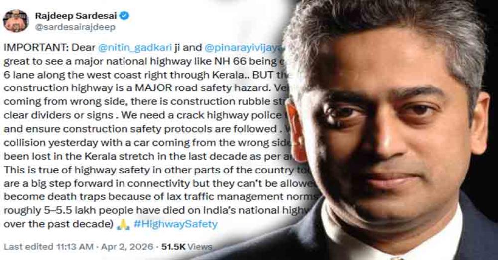 'ദേശീയപാത 66 മരണക്കെണിയാകുന്നു, വ്യക്തമായ ഡിവൈഡറുകളില്ല'; കേരളത്തിലെ ആറുവരി ദേശീയപാതയെക്കുറിച്ച് രാജ്ദീപ് സർദേശായി