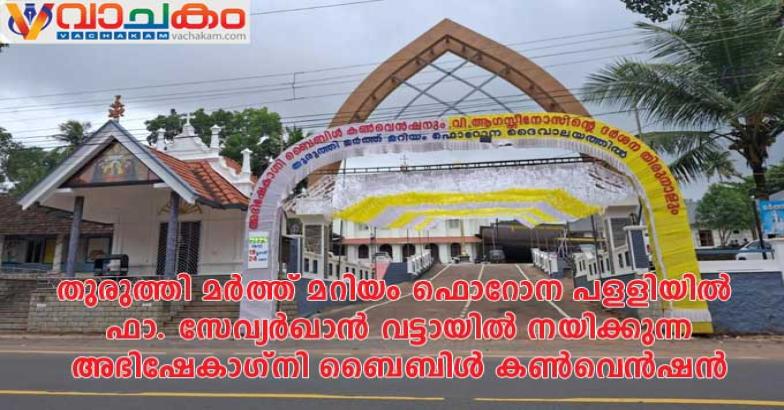 തുരുത്തി: അട്ടപ്പാടി സെഹിയോൻ ധ്യാനകേന്ദ്രം ഡയറക്ടർ ഫാ. സേവ്യർ ഖാൻ വട്ടായിൽ നയിക്കുന്ന അഭിഷേകാഗ്നി ബൈബിൾ കൺവെൻഷൻ ആഗസ്റ്റ് 15, 16, 17, 18, 19 തിയതികളിൽ വൈകുന്നേരം 4 മുതൽ വൈകുന്നേരം 9 വരെ തുരുത്തി മർത്ത് മറിയം ഫൊറോന പളളിയിൽ വിപുലമായി നടത്തുന്നു.