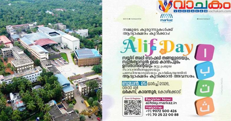 അറബി അക്ഷരമാലയിലെ ആദ്യാക്ഷരങ്ങൾ കുറിച്ചുനൽകുന്ന ചടങ്ങിനും പ്രാർത്ഥനക്കും സന്ദേശപ്രഭാഷണത്തിനും സയ്യിദ് അലി ബാഫഖി തങ്ങൾ, സി മുഹമ്മദ് ഫൈസി, വി.പി.എം ഫൈസി വില്യാപ്പള്ളി, സയ്യിദ് ശറഫുദ്ദീൻ ജമലുല്ലൈലി, ഡോ. മുഹമ്മദ് അബ്ദുൽ ഹകീം അസ്ഹരി, ഡോ. ഹുസൈൻ സഖാഫി ചുള്ളിക്കോട്, സയ്യിദ് മുഹമ്മദ് തുറാബ് സഖാഫി, സയ്യിദ് ശിഹാബുദ്ദീൻ അഹ്ദൽ മുത്തനൂർ, സയ്യിദ് അബ്ദുസ്വബൂർ ബാഹസൻ എന്നിവർ നേതൃത്വം നൽകും. പങ്കെടുക്കാൻ ആഗ്രഹിക്കുന്നവർക്ക് alifday.markaz.in എന്ന വെബ്സൈറ്റ് ലിങ്ക് വഴി മാർച്ച് 24നകം രജിസ്റ്റർ ചെയ്യാവുന്നതാണ്. കൂടുതൽ വിവരങ്ങൾക്ക്: 9072500426.