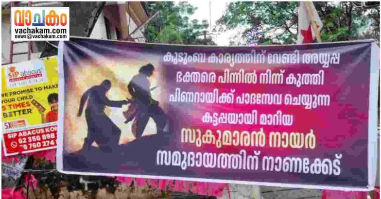 'കുടുംബ കാര്യത്തിന് വേണ്ടി അയ്യപ്പ ഭക്തരെ പിന്നില് നിന്ന് കുത്തി പിണറായിക്ക് പാദസേവ ചെയ്യുന്ന കട്ടപ്പയായി മാറിയ സുകുമാരന് നായര് സമുദായത്തിന് നാണക്കേട്' എന്ന് പോസ്റ്ററില് വിമര്ശിക്കുന്നു.