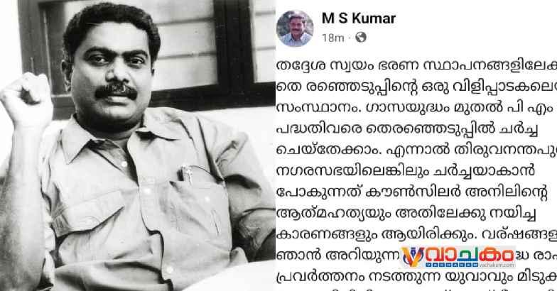 തദ്ദേശ സ്വയം ഭരണ സ്ഥാപനങ്ങളിലേക്കുള്ള തെ രഞ്ഞെടുപ്പിന്റെ ഒരു വിളിപ്പാടകലെയാണ് സംസ്ഥാനം. ഗാസയുദ്ധം മുതൽ പി എം ശ്രീ പദ്ധതിവരെ തെരഞ്ഞെടുപ്പിൽ ചർച്ച ചെയ്തേക്കാം. എന്നാൽ തിരുവനന്തപുരം നഗരസഭയിലെങ്കിലും ചർച്ചയാകാൻ പോകുന്നത് കൗൺസിലർ അനിലിന്റെ ആത്മഹത്യയും അതിലേക്കു നയിച്ച കാരണങ്ങളും ആയിരിക്കും. വര്ഷങ്ങളായി ഞാൻ അറിയുന്ന അനിൽ സംശുദ്ധ രാഷ്ട്രീയ പ്രവർത്തനം നടത്തുന്ന യുവാവും മിടുക്കനായ ജനപ്രതിനിധിയും ആണ്. രാഷ്ട്രീയത്തിൽ ഒരുപാടു ഉയരങ്ങളിൽ എത്തേണ്ട ആ ചെറുപ്പക്കാരന് പാതിവഴിയിൽ ശരീരം ഉപേക്ഷിച്ചു മടങ്ങേണ്ടി വന്നത് അദ്ദേഹം ഒരു സഹകരണ പ്രസ്ഥാനത്തിന്റെ ഭാഗം ആയിപോയതുകൊണ്ടാണ്. അവസാന നാളുകളിൽ അദ്ദേഹം അനുഭവിച്ചിട്ടുണ്ടാകാവുന്ന മാനസിക സമ്മർദ്ദം എനിക്ക് ഊഹിക്കാൻ കഴിയും. സമാനസാഹചര്യത്തിലൂടെയാണ് ഞാനും കടന്നുപോകുന്നത്. പൊതുപ്രവർത്തനത്തിന്റെ ഭാഗമായാണ് പലരും സഹകരണ മേഖലയിലും ഇടപെട്ടുപോകുന്നത്. പെട്ടെന്നാണ് കേരളത്തിൽ സഹകരണരംഗം തകർന്നടിയുന്നത്.