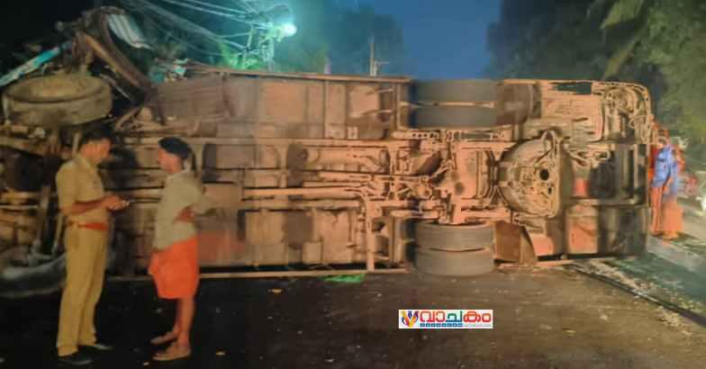 മരത്തിലും കാറിലും ഇടിച്ച ശേഷമാണ് ബസ് മറിഞ്ഞത്. നടുറോഡിന് കുറുകെയാണ് ബസ് മറിഞ്ഞത്.