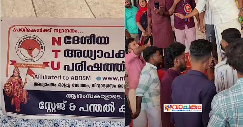കലോത്സവത്തിന് എത്തുന്ന പ്രതിഭകലെ സ്വാഗതം ചെയ്തുകൊണ്ട് ദേശീയ അധ്യാപക പരിഷത്ത് കേരള ഘടകമാണ് ബാനർ സ്ഥാപിച്ചത്. ബാനറിൽ കലോത്സവ സംഘാടക സമിതിയിലെ സ്റ്റേജ് ആൻഡ് പന്തൽ കമ്മിറ്റിയുടെ ആശംസ അറിയിച്ചുള്ള ബാനറിലാണ് കാവിക്കൊടിയേന്തിയ ഭാരതാംബയുടെ ചിത്രമുള്ളത്. ഒരു ഭാഗത്ത് സ്വാമി വിവേകാനന്ദൻറെ ചിത്രവും ഉണ്ട്.