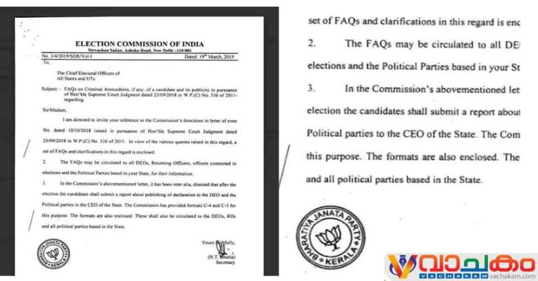 വാർത്ത തിരയുന്നവരോട് ...തെരഞ്ഞെടുപ്പ് കമ്മീഷൻ രാഷ്ട്രീയ പാർട്ടികൾക്ക് അയച്ച കത്തിനൊപ്പം ചേർത്ത affidavit ൽ തെരഞ്ഞെടുപ്പ് കമീഷന്റെ സീലിനു പകരം ബിജെപി കേരള ഘടകത്തിന്റെ സീൽ. വോട്ടിങ് മെഷീനിൽ ഏത് ബട്ടൺ ഞെക്കിയാലും താമര തെളിയുന്നു എന്ന വാർത്ത പലവട്ടം കേട്ടിട്ടുണ്ട്. എന്നാൽ ബിജെപിയും തെരഞ്ഞെടുപ്പ് കമീഷനും ഒരേ സീൽ ആണ് ഉപയോഗിക്കുന്നത് എന്ന വാർത്ത ഇതാദ്യമാണ്. ബ്രേക്കിംഗ് ന്യൂസ്. എല്ലാ ഇ മെയിൽ വിലാസക്കാർക്കും ഇത് കിട്ടിയിട്ടുണ്ട്. രണ്ട് വിലാസക്കാരോട് verify ചെയ്തു. തെരഞ്ഞെടുപ്പ് കമീഷന്റെ ഓഫീസ് തന്നെയാണ് അയച്ചതും. അതും ഉറപ്പിച്ചിട്ടുണ്ട്...