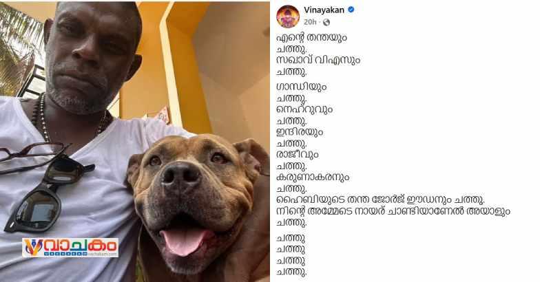 കഴിഞ്ഞ ദിവസം അന്തരിച്ച മുൻ മുഖ്യമന്ത്രി വിഎസ് അച്യുതാനന്ദന് പുറമെ ഉമ്മൻ ചാണ്ടി, മഹാത്മാ ഗാന്ധി, ജവഹർലാൽ നെഹ്റു, ഇന്ദിര ഗാന്ധി, രാജീവ് ഗാന്ധി, കെ. കരുണാകരൻ, ജോർജ് ഈഡൻ എന്നിവരുടെ പേരുകൾ കുറിച്ചു കൊണ്ടായിരുന്നു മോശപ്പെട്ട ഭാഷയിൽ വിനായകൻ പോസ്റ്റ് പങ്കുവച്ചത്.