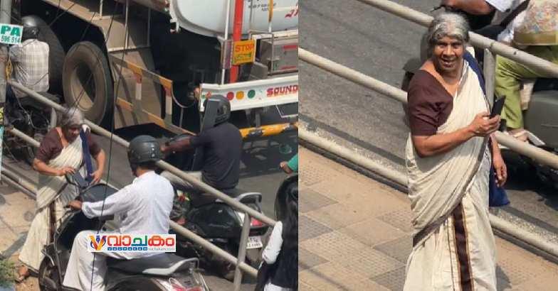 കോഴിക്കോട് സ്വദേശി പ്രഭാവതി അമ്മയാണ് സ്കൂട്ടർ യാത്രികനെ തടഞ്ഞത്. അഫ്ലു സ്റ്റോറീസ് എന്ന വ്ലോഗർ പകർത്തിയതാണ് ദൃശ്യങ്ങൾ.