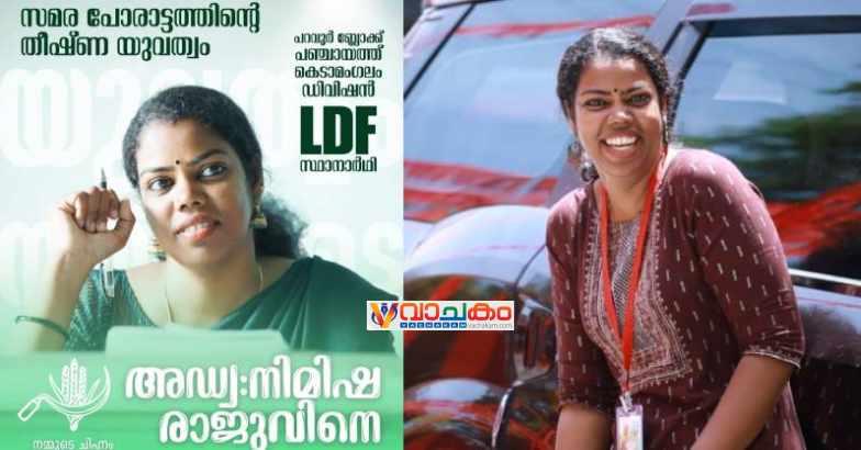 പറവൂർ ബ്ലോക്കിൽ കെടാമംഗലം ഡിവിഷനിൽനിന്നാണ് നിമിഷ രാജു എൽഡിഎഫ് സ്ഥാനാർഥിയായി മത്സരിക്കുന്നത്.