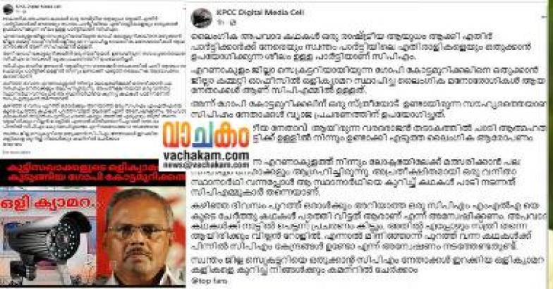 എറണാകുളം ജില്ലാ സെക്രട്ടറിയായിയുന്ന ഗോപി കോട്ടമുറിക്കലിനെ ഒതുക്കാൻ ജില്ലാ കമ്മറ്റി ഓഫീസിൽ ഒളിക്യാമറ സ്ഥാപിച്ച ലൈംഗിക മനോരോഗികൾ ആയ നേതാക്കൾ ആണ് സിപിഎമ്മിൽ ഉള്ളതെന്നും അദ്ദേഹം പറഞ്ഞു.