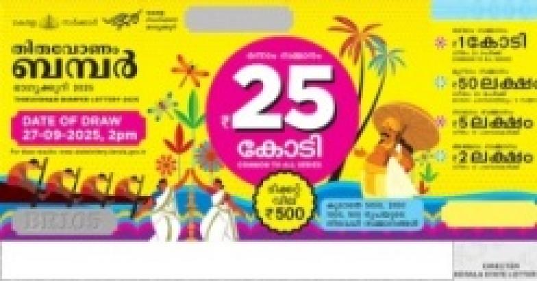 കേരള സംസ്ഥാന ഭാഗ്യക്കുറി വകുപ്പിന്റെ ഇത്തവണത്തെ ഓണം ബമ്പര് ഫലം പ്രഖ്യാപിച്ചു. TH 577825 എന്ന നമ്പറാണ് ഒന്നാം സമ്മാനമായ 25 കോടിക്ക് അര്ഹമായത്. ഒരുകോടി വീതം 20 പേര്ക്കാണ് രണ്ടാം സമ്മാനം. മൂന്നാം സമ്മാനം 50 ലക്ഷം രൂപ വീതം 20 പേര്ക്കാണ്.