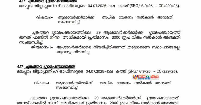 മലപ്പുറം: തദ്ദേശസ്വയംഭരണ വകുപ്പ് ആശാവർക്കർമാർക്ക് അധികവേതനം നൽകുന്നതിന് അനുമതി നിഷേധിച്ചു.