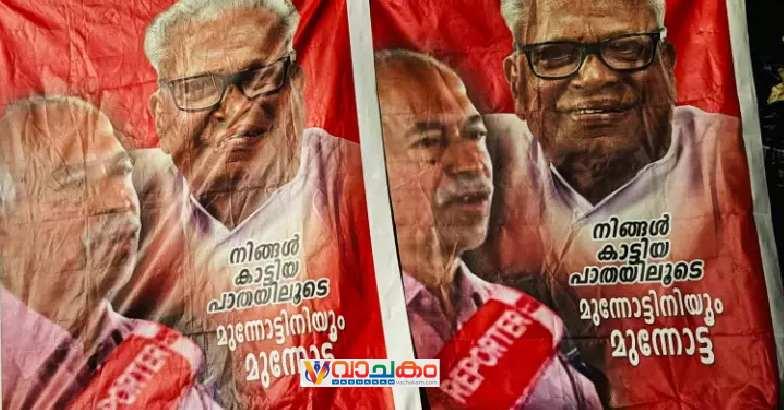 വി.എസ് അച്യുതാനന്ദൻ്റെയും ഫോട്ടോ ഫ്ലക്സിലുണ്ട്. കണ്ണൂരിൽ വി. കുഞ്ഞികൃഷ്ണനെതിരെ വെച്ച ബോർഡ് നശിപ്പിച്ചിരുന്നു.