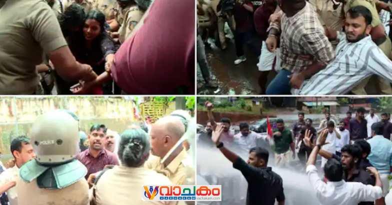 ബാരിക്കേഡ് മറിച്ചിടാൻ ശ്രമിച്ച പ്രവർത്തകർക്ക് നേരെ പൊലീസ് ജലപീരങ്കി പ്രയോഗിച്ചു. ലാത്തിവീശിയതിനെ തുടർന്ന് പ്രവർത്തകർ മതിൽ ചാടിക്കടന്നു. പ്രവർത്തകരെ തടയാനുള്ള ശ്രമങ്ങൾ നടന്നുവരികയാണ്.