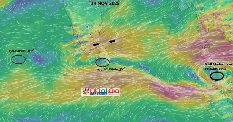 കന്യാകുമാരി കടലിനും സമീപത്തുമായി തുടരുന്ന ചക്രവാത ചുഴി അടുത്തമണിക്കൂറുകളിൽ ന്യൂന മർദ്ദമായി ശക്തി പ്രാപിക്കാൻ സാധ്യത.