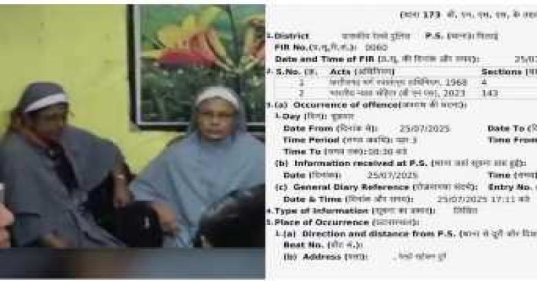 ഡൽഹി: ഛത്തീസ്ഗഡില് കന്യാസ്ത്രീകൾക്ക് എതിരായ കേസില് ചുമത്തിയത് ഗുരുതര വകുപ്പുകളെന്ന് റിപ്പോർട്ട്. സിസ്റ്റർ പ്രീതി ഒന്നാം പ്രതിയും സിസ്റ്റർ വന്ദന രണ്ടാം പ്രതിയുമാണ്. നിർബന്ധിത മത പരിവർത്തന നിരോധന നിയമം സെക്ഷൻ 4, ബിഎൻഎസ് 143 എന്നീ കുറ്റങ്ങൾ ചുമത്തി എന്നാണ് ലഭിക്കുന്ന വിവരം. പെൺകുട്ടികളെ നിർബന്ധിച്ച് മതം മാറ്റിയെന്ന് സംശയിക്കുന്നു, മനുഷ്യ കടത്തും സംശയിക്കുന്നുവെന്നാണ് എഫ്ഐആറില് വ്യക്തമാക്കുന്നത്.