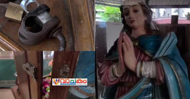 അള്ത്താരയുടെ മുന്പിലുണ്ടായിരുന്ന മൈക്ക്സ്റ്റാന്ഡെടുത്ത് മാതാവിന്റെ രൂപക്കൂടിന്റെ പൂട്ട് തല്ലിത്തകര്ത്താണ് മോഷണം നടത്തിയത്.