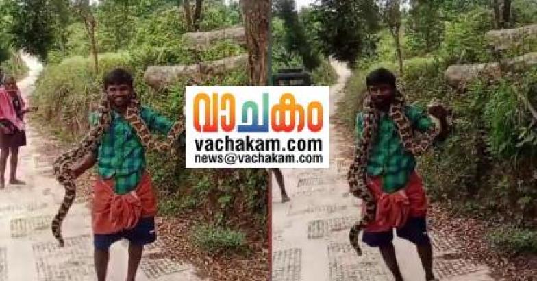 അപ്പോഴാണ് പ്രദേശവാസിയായ യുവാവ് മലമ്പാമ്പിനെ കഴുത്തിലിട്ട് നിൽക്കുന്ന കാഴ്ച കണ്ടത്. വനം വകുപ്പ് ഉദ്യോഗസ്ഥർ എത്തിയപ്പോഴാണ് യുവാവ് മലമ്പാമ്പിനെ കൈമാറിയത്.