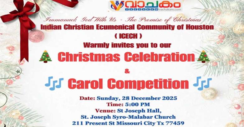ഹൂസ്റ്റൺ: ഇന്ത്യൻ ക്രിസ്ത്യൻ എക്യൂമിനിക്കൽ കമ്മ്യൂണിറ്റി ഓഫ് ഹൂസ്റ്റന്റെ (ICECH) ആഭിമുഖ്യത്തിൽ എല്ലാ വർഷവും നടത്തി വരുന്ന ക്രിസ്തുമസ് കരോളും കരോൾ ഗാന മത്സരവും 2025 ഡിസംബർ 28നു വൈകിട്ടു 5മണിക്ക് ഹൂസ്റ്റൻ സെന്റ് ജോസഫ് സീറോ മലബാർ ചർച്ച് ഹാളിൽ വെച്ചു നടത്തപ്പെടുന്നു.