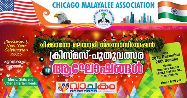 ഷിക്കാഗോ : ഷിക്കാഗോ മലയാളി അസോസിയേഷന്റെ ആഭിമുഖ്യത്തിൽ നടത്തപ്പെടുന്ന ക്രിസ്മസ് പുതുവത്സരാഘോഷങ്ങൾ ഡിസംബർ 28ന് വൈകിട്ട് 6 മണിക്ക് ഡെസ്പ്ലെയിൻസിലുള്ള ക്നാനായ സെന്റർ ഓഡിറ്റോറിയത്തിൽ വെച്ച് നടത്തപ്പെടുന്നതാണ്.