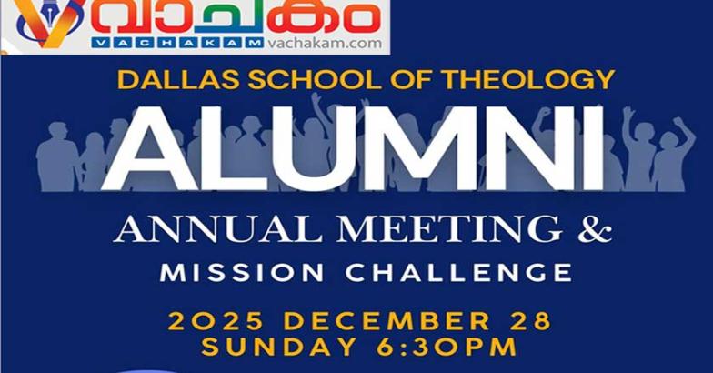 ഡാലസ്: ക്രൈസ്തവ ശുശ്രൂഷാ രംഗത്ത് നിർണ്ണായക സ്വാധീനം ചെലുത്തുന്ന ഡാലസ് സ്‌കൂൾ ഓഫ് തിയോളജി പൂർവ്വ വിദ്യാർത്ഥി അസോസിയേഷന്റെ (Alumni Association) ഈ വർഷത്തെ വാർഷിക സമ്മേളനം 2025 ഡിസംബർ 28ന് ഞായറാഴ്ച നടത്തപ്പെടും. ആഗോളതലത്തിൽ പ്രവർത്തിക്കുന്ന പൂർവ്വ വിദ്യാർത്ഥികളെ ഒന്നിപ്പിക്കുക എന്ന ലക്ഷ്യത്തോടെ വൈകുന്നേരം 6:30ന് സൂം പ്ലാറ്റ്‌ഫോം വഴിയാണ് സംഗമം ക്രമീകരിച്ചിരിക്കുന്നത്.