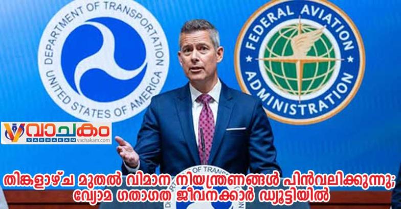 വാഷിംഗ്ടൺ ഡി.സി.: എയർ ട്രാഫിക് കൺട്രോൾ ജീവനക്കാരുടെ എണ്ണത്തിൽ പുരോഗതി വന്നതിനെ തുടർന്ന്, വിമാന സർവീസുകൾക്ക് ഏർപ്പെടുത്തിയ അടിയന്തര നിയന്ത്രണങ്ങൾ ഫെഡറൽ ഏവിയേഷൻ അഡ്മിനിസ്‌ട്രേഷൻ (FAA) തിങ്കളാഴ്ച രാവിലെ മുതൽ ഔദ്യോഗികമായി പിൻവലിക്കും.
