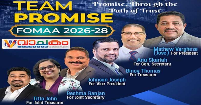 വിശ്വസ്തത-സത്യസന്ധത-പ്രതിബദ്ധത-സുതാര്യത മുഖമുദ്രയാക്കി സംഘടനയുടെ യശസ്സ് കാത്തുസൂക്ഷിച്ചു പ്രവർത്തിക്കുമെന്ന പ്രഖ്യാപനവുമായി ഫോമാ തെരഞ്ഞെടുപ്പിൽ മത്സരിക്കുന്ന മാത്യു വർഗീസ് നേതൃത്വം നൽകുന്ന ടീം പ്രോമിസിന്റ ഫ്ളോറിഡ പ്രചാരണയാത്രക്ക് നവംബർ 21 വെള്ളിയാഴ്ച്ച മയാമിയിൽ തുടക്കം കുറിക്കും.