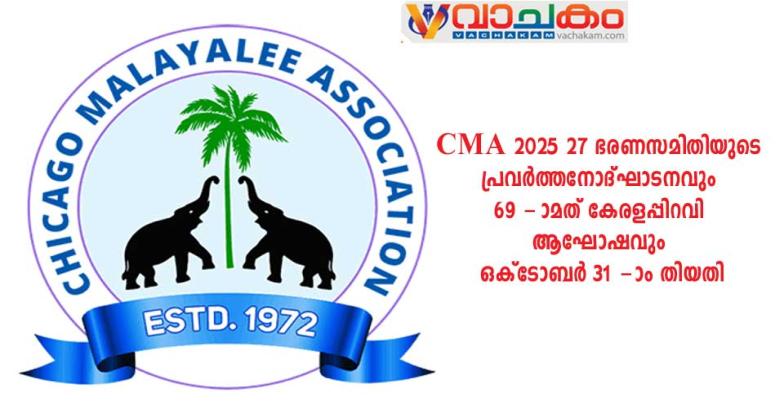 ഷിക്കാഗോ മലയാളി അസോസിയേഷന്റെ 2025 -27 കാലഘട്ടത്തിലേക്കുള്ള ഭരണസമിതിയുടെ പ്രവർത്തനോദ്ഘാടനവും 69 -ാമത് കേരളപ്പിറവി ആഘോഷവും ഒക്ടോബർ 31 -ാം തിയതി വൈകുന്നേരം 7.30ന് മോർട്ടൻ ഗ്രോവിലെ സെന്റ് മേരീസ് ക്നാനായ ചർച്ച് ഓഡിറ്റോറിയത്തിൽ വച്ച് നടത്തപ്പെടുന്നു.