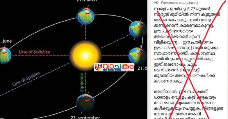 സൂര്യൻ ഭൂമിയിൽ നിന്ന് കൂടുതൽ അകന്നുപോകും. ഇത് വായു തണുക്കാൻ കാരണമാകുന്ന അഫീലയന് (Aphelion) പ്രതിഭാസമാണെന്നും ഈ പ്രതിഭാസം ഈ വർഷം ഓഗസ്റ്റ് വരെ തുടരുമെന്നും വാട്സ് ആപ്പിൽ പ്രചരിക്കുന്ന സന്ദേശത്തിൽ പറയുന്നു.