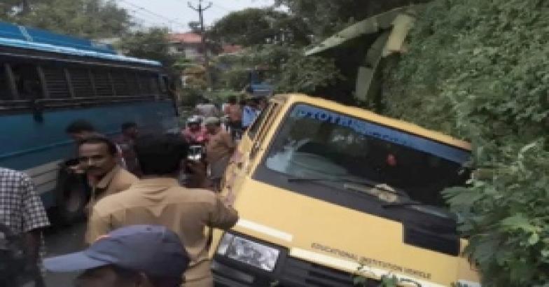 ആനച്ചല് ജംഗ്ഷനില് നിന്ന് ഇറക്കം ഇറങ്ങുമ്പോള് എതിരെ വന്ന സ്വകാര്യ ബസ്സിന് സൈഡ് കൊടുക്കുന്നതിനിടയില് സ്വകാര്യ ബസ്സിന്റെ പിന്ഭാഗം സ്കൂള് ബസ്സില് തട്ടുകയായിരുന്നു. പിന്നാലെ സ്കൂള് ബസ് റോഡിന് സമീപത്തെ ഓടയിലേക്ക് മറിഞ്ഞു.അപകടത്തിൽ ഒരു വിദ്യാര്ത്ഥിക്ക് പരിക്കേറ്റു. ഏഴു കുട്ടികള് ബസ്സില് ഉണ്ടായിരുന്നതായാണ് ലഭ്യമായ വിവരം.
