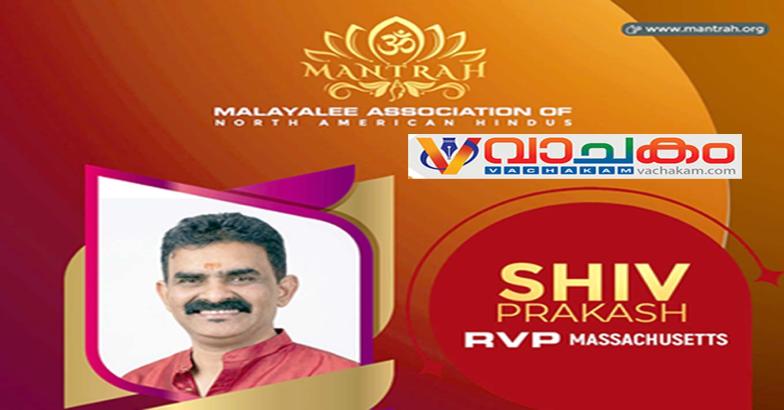 ബോസ്റ്റൺ മലയാളി സമൂഹത്തിൽ സജീവ സാന്നിധ്യമായ ശിവ പ്രകാശ്, MANTRAH (Malayalee Association of North American Hindus) ബോസ്റ്റൺ റീജിയണൽ വൈസ് പ്രസിഡന്റായി ചുമതലയേറ്റതായി സംഘടന ഔദ്യോഗികമായി അറിയിച്ചു.