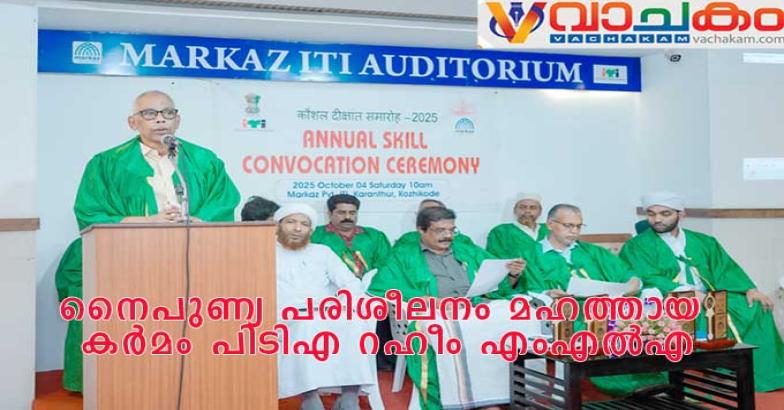 കോഴിക്കോട്: വിവിധ നൈപുണികളിൽ കൃത്യമായ പരിശീലനവും വൈദഗ്ധ്യവും നേടുന്നത് മഹത്തായ കർമമാണെന്നും നിപുണനായ മനുഷ്യരുടെ സാന്നിധ്യമാണ് സമൂഹത്തെ ഉന്നമനത്തിലേക്ക് നയിക്കുകയെന്നും പിടിഎ റഹീം എംഎൽഎ. മർകസ് ഐടിഐയിൽ നിന്ന് 2024 -25 അധ്യയന വർഷം പഠനം പൂർത്തിയാക്കി വിവിധ കമ്പനികളിലും സ്ഥാപനങ്ങളിലും ജോലി നേടിയ വിദ്യാർത്ഥികൾക്കുള്ള കോൺവൊക്കേഷൻ ഉദ്ഘാടനം ചെയ്ത് സംസാരിക്കുകയായിരുന്നു അദ്ദേഹം. തൊഴിലധിഷ്ഠിത വിദ്യാഭ്യാസ രംഗത്ത് സ്ഥാപിതകാലം മുതൽ പ്രത്യേക ശ്രദ്ധ പുലർത്തുന്ന മർകസ് മാനേജ്‌മെന്റ് പ്രത്യേക പ്രശംസയർഹിക്കുന്നുവെന്നും എംഎൽഎ പറഞ്ഞു. ഐടിഐ ഓഡിറ്റോറിയത്തിൽ നടന്ന സനദ്ദാന ചടങ്ങിൽ മർകസ് ഡയറക്ടർ ജനറൽ സി മുഹമ്മദ് ഫൈസി മുഖ്യപ്രഭാഷണം നടത്തി. പ്രിൻസിപ്പൽ എൻ മുഹമ്മദലി അധ്യക്ഷത വഹിച്ചു.