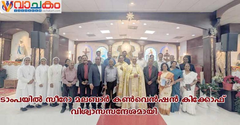 ഷിക്കാഗോ: അമേരിക്കയിലെ സീറോ മലബാർ രൂപതയുടെ സിൽവർ ജൂബിലി ആഘോഷങ്ങളുടെ ഭാഗമായി 2026 ജൂലൈ 9 മുതൽ 12 വരെ ഷിക്കാഗോയിൽ സംഘടിപ്പിക്കുന്ന ദേശീയ സീറോ മലബാർ കൺവെൻഷന്റെ പ്രചാരണത്തിനും കിക്കോഫിനുമായി കൺവെൻഷൻ ടീം ഫ്ളോറിഡയിലെ ടാംപയിലെ സെന്റ് ജോസഫ്സ് സീറോ മലബാർ ചർച്ച് സന്ദർശിച്ചു. സ്നേഹവും ശാന്തതയും നിറഞ്ഞ അന്തരീക്ഷത്തിൽ നടന്ന കിക്കോഫിൽ ഇടവകാംഗങ്ങൾ കുടുംബസമേതം പങ്കെടുത്തു. അവരുടെ ഹൃദയം നിറഞ്ഞ സാന്നിധ്യം ഈ പരിപാടിക്ക് പ്രത്യേകമായ വിശ്വാസഭാവം നൽകി.