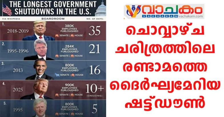വാഷിംഗ്ടൺ: ചൊവ്വാഴ്ചത്തെ ഷട്ട്ഡൗൺ 1995-1996 കാലത്തെ ഷട്ട്ഡൗൺ യുണൈറ്റഡ് സ്റ്റേറ്റ്സ് ചരിത്രത്തിലെ രണ്ടാമത്തെ ദൈർഘ്യമേറിയ ഷട്ട്ഡൗണിന് തുല്യമാക്കി. ഒക്ടോബർ 22 ബുധനാഴ്ച വരെ ഷട്ട്ഡൗൺ തുടർന്നാൽ, 22 ദിവസങ്ങളുള്ള രണ്ടാമത്തെ ദൈർഘ്യമേറിയ ഷട്ട്ഡൗണായി ഇത് മാറും, ട്രംപിന്റെ ആദ്യ ഭരണകാലത്ത് 2017ൽ 35 ദിവസത്തെ ഷട്ട്ഡൗണിന് പിന്നിൽ.