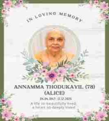 അന്നമ്മ തൊടുകയിൽ (ആലീസ് ) 78 ഷിക്കാഗോയിൽ നിര്യാതയായി. ശവസംസ്ക്കാരം പിന്നീട്.