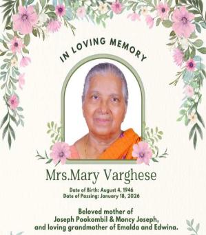 മേരി വർഗീസിന്റെ സംസ്കാര ശുശ്രൂഷകൾ ജനുവരി 24 ശനിയാഴ്ച നടക്കും. അന്നേ ദിവസം രാവിലെ 9 മണിക്ക് ലണ്ടനിലെ സെന്റ് മേരീസ് സീറോ മലബാർ പള്ളിയിലാണ് പൊതുദർശനവും ശുശ്രൂഷകളും ക്രമീകരിച്ചിരിക്കുന്നത്. തുടർന്ന് സെന്റ് പീറ്റേഴ്സ് സെമിത്തേരിയിൽ സംസ്കാര ചടങ്ങുകൾ നടക്കും. പരേതയുടെ ആത്മാവിനായി പ്രാർത്ഥനകൾ അഭ്യർത്ഥിക്കുന്നതായി കുടുംബാംഗങ്ങൾ അറിയിച്ചു.