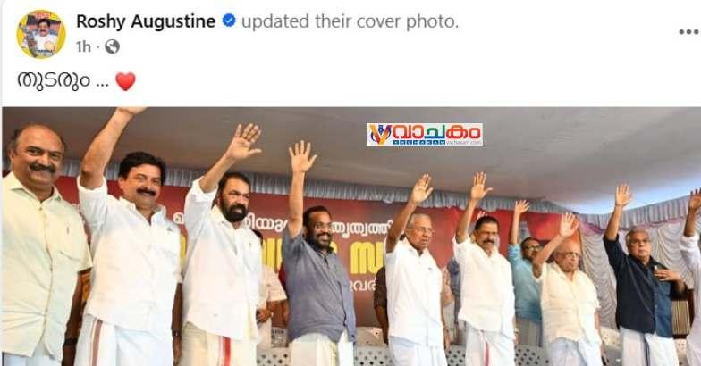 പിണറായി വിജയനും ഇടത് നേതാക്കൾക്കുമൊപ്പം നിൽക്കുന്ന ഫോട്ടോ 'തുടരും' എന്ന അടിക്കുറിപ്പോടെ റോഷി ഫേസ്ബുക്ക് കവർ ചിത്രമാക്കി.