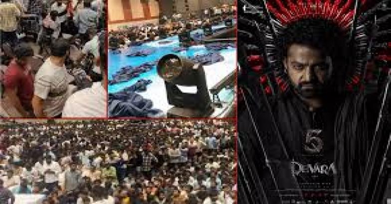 ദേവരയുടെ പ്രീ-റിലീസ് ഇവൻ്റ് ജൂനിയർ എൻടിആർ റദ്ദാക്കിയതിന് പിന്നാലെ അക്രമാസക്തരായ ആരാധകർ ഓഡിറ്റോറിയം തകർത്തു.