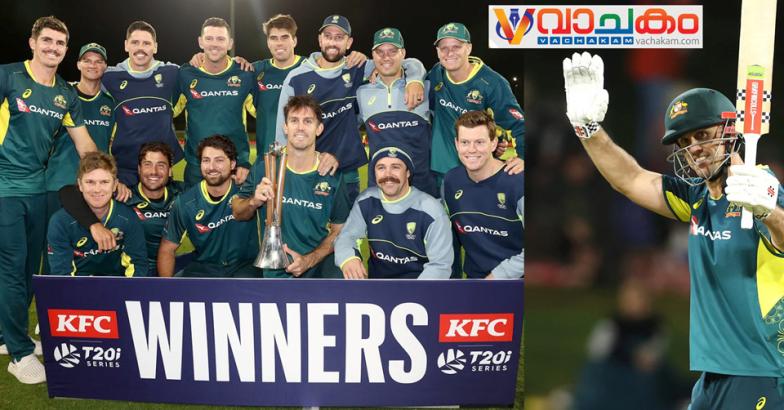 ന്യൂസിലൻഡിനെതിരായ ടി20 പരമ്പര സ്വന്തമാക്കി ഓസ്ട്രേലിയ. മൂന്നാം മത്സരത്തിൽ മൂന്ന് വിക്കറ്റിന് വിജയിച്ചതോടെയാണ് ഓസീസ് പരമ്പര സ്വന്തമാക്കിയത്. 2-0 എന്ന മാർജിനിലാണ് പരമ്പര ഓസീസ് വിജയിച്ചത്. ആദ്യ മത്സരത്തിൽ ഓസീസ് ആറ് വിക്കറ്റിന് വിജയിച്ചിരുന്നു. എന്നാൽ രണ്ടാം മത്സരം മഴയെ തുടർന്ന് ഉപേക്ഷിച്ചു.