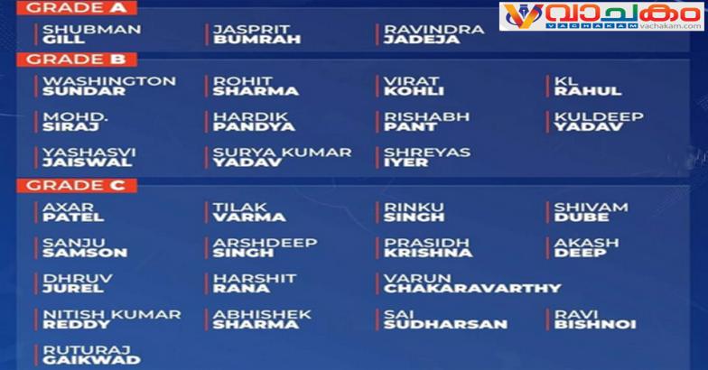 ഗ്രേഡ് എ: ശുഭ്മൻ ഗിൽ, ജസ്പ്രീത് ബുമ്ര, രവീന്ദ്ര ജഡേജ.