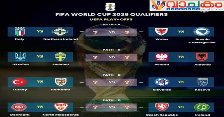 ഫിഫ ലോകകപ്പ് യോഗ്യതക്കായുള്ള യൂറോപ്യൻ പ്ലെ ഓഫ് ഫിക്സ്ചറായി. 16 ടീമുകൾ മത്സരിക്കുന്ന പ്ലെ ഓഫിൽ നിന്നു നാലു ടീമുകളാണ് ഇനി ലോകകപ്പിലേക്ക് യോഗ്യത നേടുക. മാർച്ചിൽ നടക്കുന്ന പ്ലെ ഓഫ് ഒരൊറ്റ സെമിഫൈനൽ, ഒരു ഫൈനൽ എന്ന രീതിയിലാണ് നടക്കുക. 2014ന് ശേഷം ലോകകപ്പ് യോഗ്യത നേടാൻ സാധിക്കാത്ത നാലു തവണ ലോക ചാമ്പ്യന്മാരായ ഇറ്റലിക്ക് ഒന്നാം പ്ലെ ഓഫ് സെമിഫൈനലിൽ വടക്കൻ അയർലൻഡാണ് എതിരാളികൾ. സ്വന്തം രാജ്യത്താവും ഇറ്റലി വടക്കൻ അയർലൻഡിനെ നേരിടുക. ഈ മത്സരത്തിൽ ജയിക്കുന്ന ടീം രണ്ടാം പ്ലെ ഓഫ് സെമിഫൈനലിലെ വിജയിയെ ആവും പ്ലെ ഓഫ് ഫൈനലിൽ നേരിടുക. ഇതിൽ വെയിൽസ് സ്വന്തം മൈതാനത്ത് ബോസ്നിയ ആന്റ് ഹെർസെഗോവിനയെ ആണ് നേരിടുക. സെമിഫൈനലിൽ ജയിക്കുന്ന ടീമിൽ ഏറ്റവും മികച്ച ഫിഫ റാങ്കുള്ള ടീമിന്റെ രാജ്യത്താവും പ്ലെ ഓഫ് ഫൈനൽ നടക്കുക.