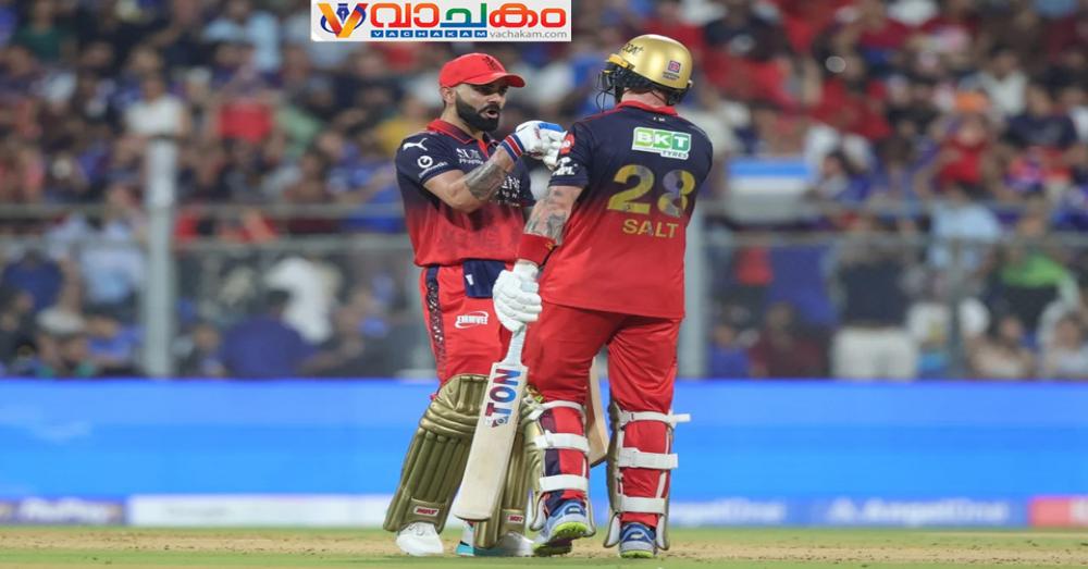 ടോസ് നേടി ആർ.സി.ബിയെ ബാറ്റിംഗിനിറക്കിയ മുംബയ് ഇന്ത്യൻസിനെ ഞെട്ടിക്കുന്ന തുടക്കമാണ് ഫിൽ സാൾട്ടും വിരാടും ചേർന്ന് നൽകിയത്. അഞ്ചാം ഓവറിൽ 50 റൺസും ഒൻപതാം ഓവറിൽ 100 റൺസും കടന്ന് ആർ.സി.ബി മുന്നേറി. 25 പന്തുകളിൽ അർദ്ധസെഞ്ച്വറി തികച്ച സാൾട്ടിനെ 11-ാം ഓവറിൽ ശാർദൂൽ താക്കൂർ ഹാർദിക് പാണ്ഡ്യയെ ഏൽപ്പിച്ചപ്പോൾ ആർ.സി.ബി 120 റൺസിലെത്തിയിരുന്നു.