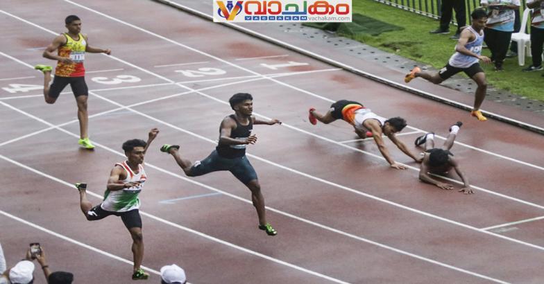 തിരുവനന്തപുരം : മഴപെയ്ത് നനഞ്ഞ് കുതിർന്ന ചന്ദ്രശേഖരൻ നായർ സ്റ്റേഡിയത്തിലെ സിന്തറ്റിക് ട്രാക്കിൽ ഹർഡിൽസിൽ ഒരു റെക്കാഡ് ഉൾപ്പടെ തീപ്പൊരി പ്രകടനങ്ങൾ നടന്നെങ്കിലും പലരും ട്രാക്കിൽ തെന്നി അടിതെറ്റി വീഴുകയും ചെയ്തു. സീനിയർ, ജൂനിയർ ആൺകുട്ടികളുടെ 110 മീറ്റർ ഹർഡിൽസുകളിലായിരുന്നു വീഴ്ച കൂടുതൽ. സീനിയർ ആൺകുട്ടികളിൽ മലപ്പുറം ഐഡിയൽ സ്കൂളിന്റെ ഉറച്ച മെഡൽ പ്രതീക്ഷയായിരുന്ന ഷാരോൺ ശങ്കറാണ് അടിതെറ്റി വീണത്. ജൂനിയർ ആൺകുട്ടികളിൽ ഫിനിഷ് ലൈൻ തൊടവേ രണ്ടാം ട്രാക്കിൽ ഓടിയ പാലക്കാടിന്റെ അതുൽകൃഷ്ണയും മൂന്നാം ട്രാക്കിലെ കോഴിക്കോടിന്റെ യശ്വന്ത് സിംഗും തമ്മിൽ തട്ടി തെറിച്ച് വീണു.