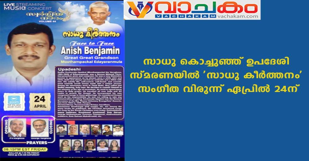 സാധു കൊച്ചുഞ്ഞ് ഉപദേശി സ്മരണയിൽ 'സാധു കീർത്തനം' സംഗീത വിരുന്ന് ഏപ്രിൽ 24ന്