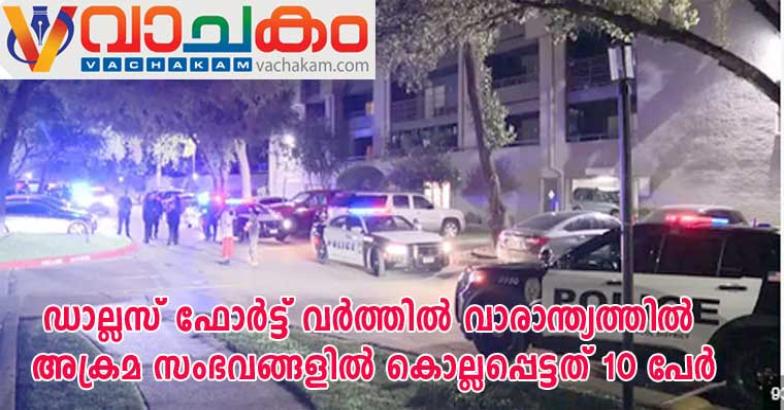 ഡാല്ലസ് ഫോർത്ത് വർത്തിലെ വിവിധ ഭാഗങ്ങളിലായി ഒക്ടോബർ 3 മുതൽ 6 വരെ നടന്ന അക്രമ സംഭവങ്ങളിൽ 10 പേർ കൊല്ലപ്പെട്ടതായി പോലീസ് അറിയിച്ചു.