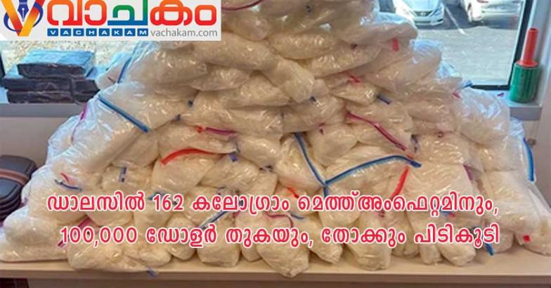 ഡാളസ് : വെസ്റ്റ് ഓക്ക് ക്ലിഫ് ഭാഗത്ത് മയക്കുമരുന്ന് കടത്തുകാരനെ കുറിച്ചു ലഭിച്ച വിവരത്തിന്റെ അടിസ്ഥാനമാക്കി, ഡാലസ് പോലീസ് ഒക്ടോബർ ആദ്യവാരം നടത്തിയ റെയ്ഡിൽ 162 കിലോഗ്രാം മെത്ത്അംഫെറ്റമിനും, $100,000 തുകയും, തോക്കും പിടികൂടി.