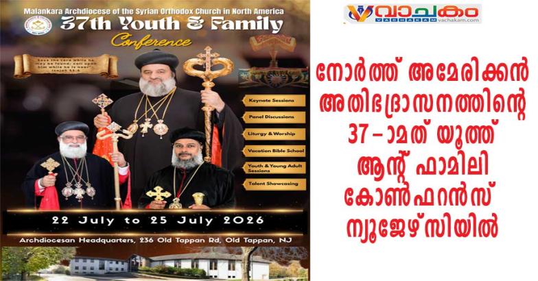 ന്യൂജേഴ്സി: യാക്കോബായ സുറിയാനി ഓർത്തഡോക്സ് സഭയുടെ നോർത്ത് അമേരിക്കൻ അതിഭദ്രാസനത്തിന്റെ 37-ാമത് യൂത്ത് ആന്റ് ഫാമിലി കോൺഫറൻസ് 2026 ജൂലൈ മാസം 22 മുതൽ 25 വരെ നോർത്ത് അമേരിക്കൻ അതിഭദ്രാസന ആസ്ഥാനത്ത് വച്ച് (236 Old Tappan Rd, Old Tappan, NJ) നടത്തുവാൻ 2026 ജനുവരി 9-ാം തീയതി അതിഭദ്രാസനാധിപൻ അഭിവന്ദ്യ യൽദോ മോർ തീത്തോസ് തിരുമേനിയുടെ അദ്ധ്യക്ഷതയിൽ ചേർന്ന ഭദ്രാസന കൗൺസിൽ യോഗത്തിൽ തീരുമാനിച്ചു.